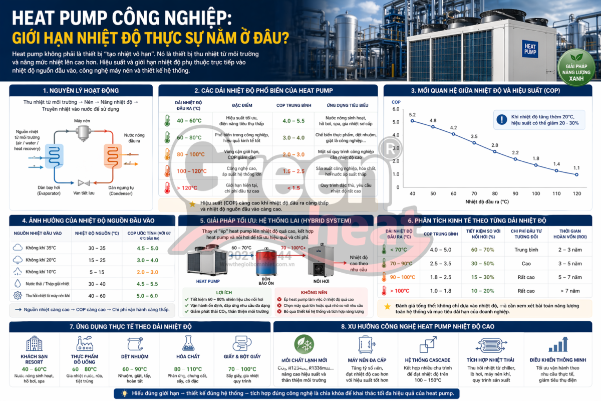Trên thực tế, hệ thống bơm nhiệt công nghiệp hiện nay được chia thành các dải nhiệt độ chính: